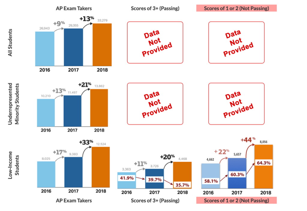 So is this the case? That is what Total Registration, a test registration service which handled 50 schools involved with the pilot test, asked themselves. What they found was astounding. Of the 3141 additional low-income students who took the test, only 742 of them received a 3 or higher, at a rate of 23.6% for the “additional” low-income test takers. “Another way to look at this is that 76.4% of the low-income students who were coerced to take the exams because of the new deadline, late fees cancellation fees did not pass … Clearly an early commitment to the exam does NOT cause students to ‘. . . earn a score on the AP Exam that qualifies for college credit and/or placement’ as the college board claims.”